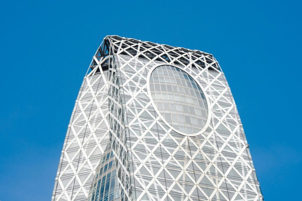 外観を覆う白い帯は、建物全体を包み込んでいるように見えるが、実際には直線と曲線を織り交ぜた複雑な構造。高層ビルにありがちな均一性を排し、未来的で柔らかな印象を与えている。