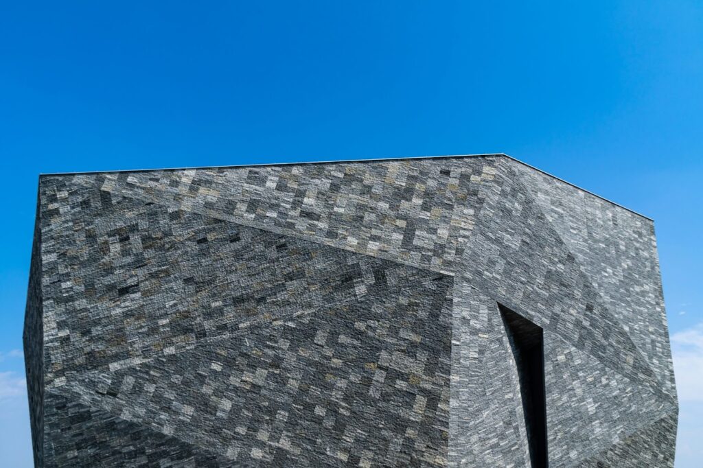 設計は隈研吾氏。巨大な花崗岩の塊が地面から立ち上がったような外観は、まるで自然の地形がそのまま建築物へと変化したかのよう。特徴は、約2万枚の花崗岩の板材を積み上げた石の立体で、直線と斜線が複雑に交差し、見る角度によって表情が変わる造形は圧倒的だ。